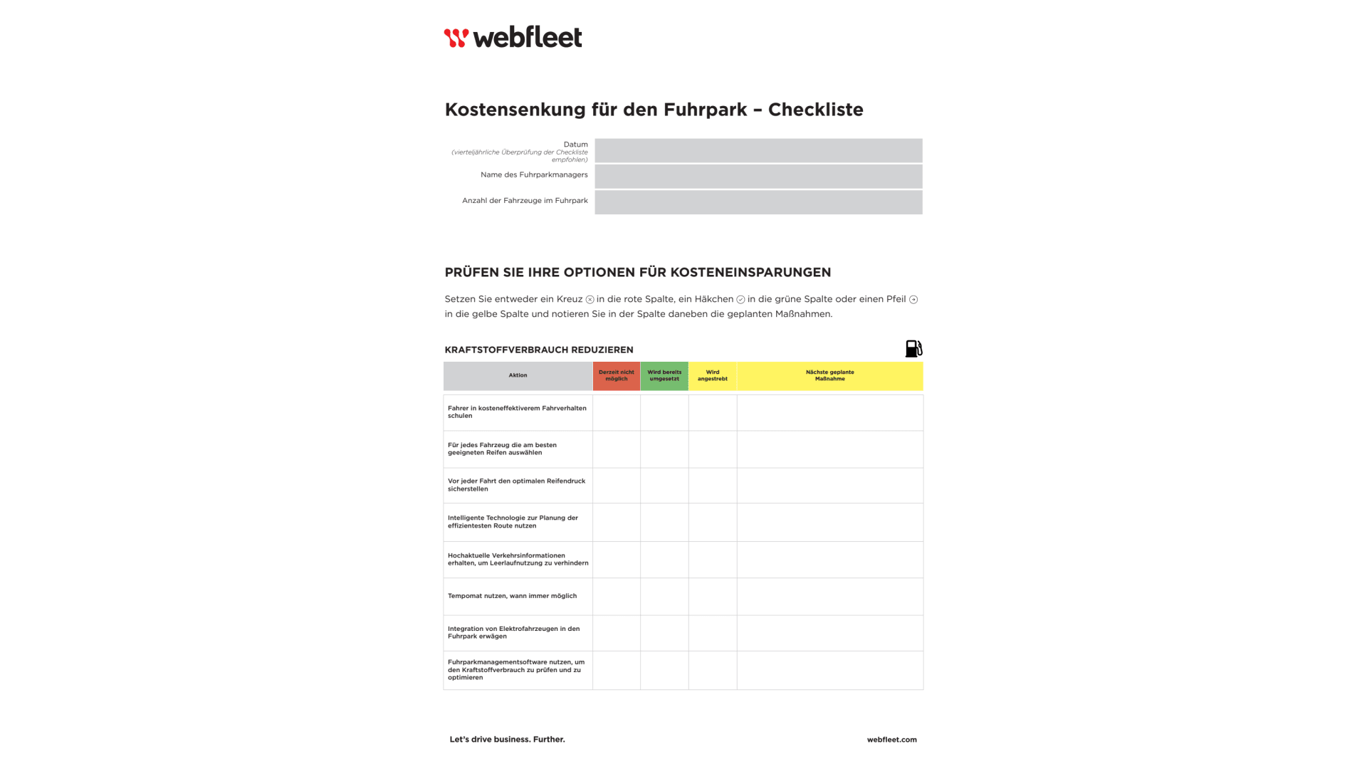 Senken Sie Ihre Fuhrpark­kosten Schritt für Schritt – mit dieser kostenlosen, druckbaren Checkliste.