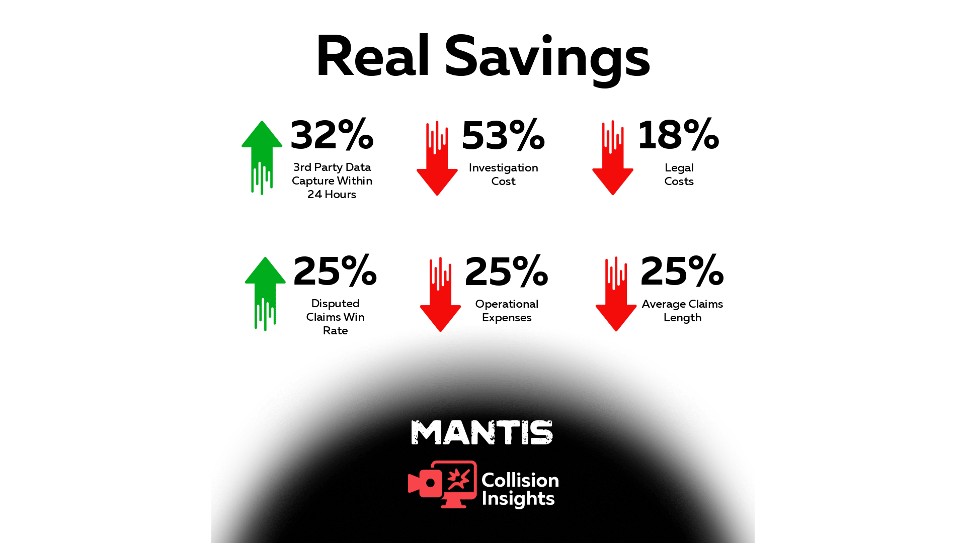 - MANTIS Collision Insights helps fleets resolve accident claims faster and more cost-effectively. It uses AI to instantly detect incidents and generate detailed FNOL reports with dashcam footage, GPS, and impact data—cutting claim time by 25% and investigation costs by over half. The result: quicker liability decisions, reduced legal spend, and lower insurance premiums through smarter risk management.