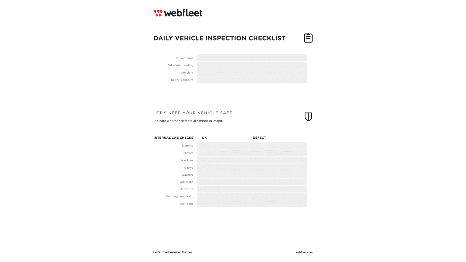 Vehicles that are well maintained tend to run better—and longer. Doing internal and external cab checks with a checklist gives you visibility over vehicle health. Should you schedule in tyre changes or new brake pads? The vehicle checklist will help you decide.