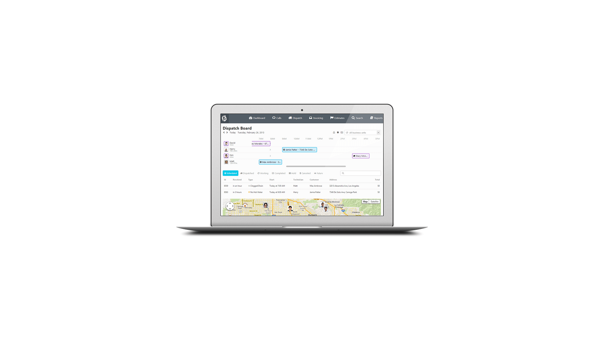 - Using an interated dispatch screen, job locations and technicians are visible on the map to identify which technicians are available.