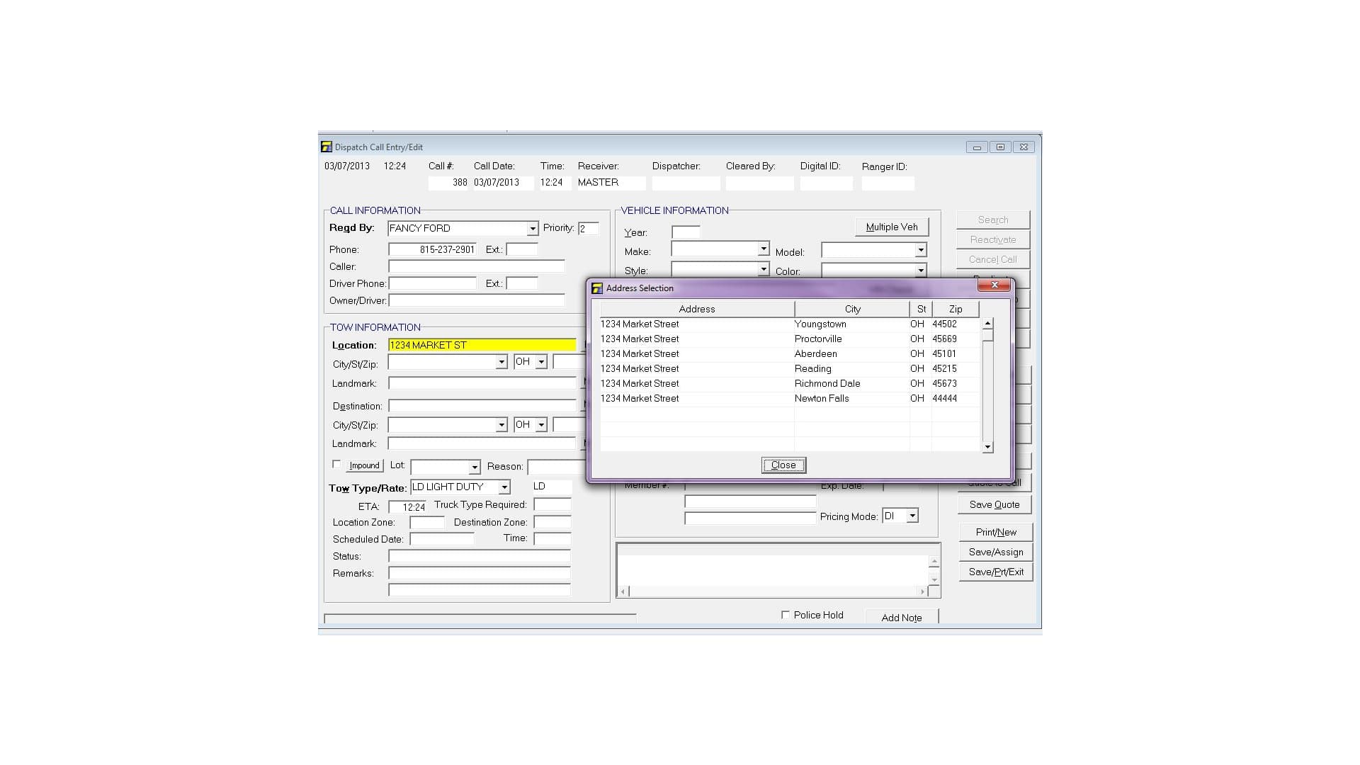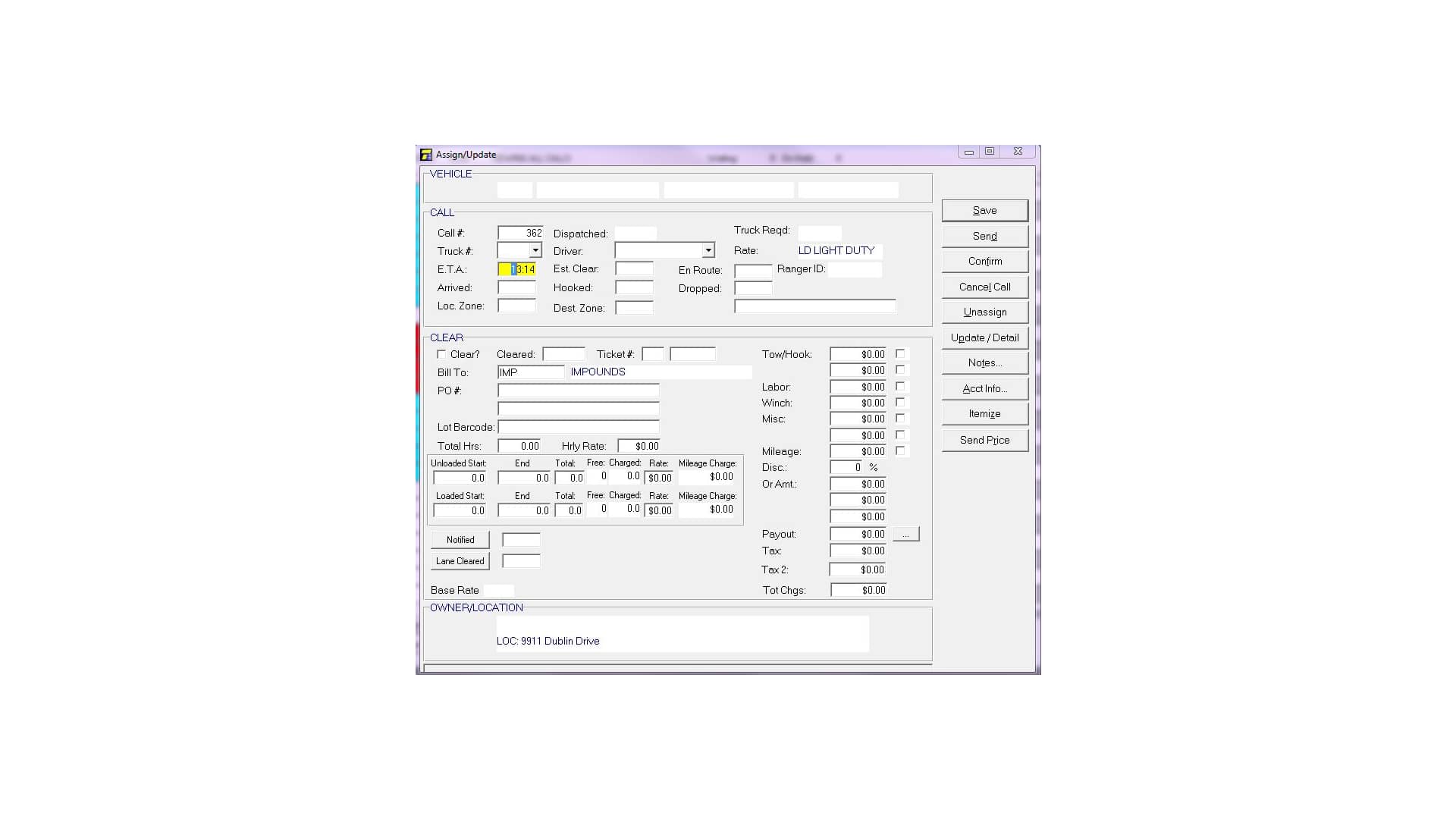 Tracker offers vehicle tracking and 2-way communication with the drivers via Webfleet. Dispatch tow calls from motor clubs or police dept calls to the nearest available truck. The dispatched calls contain all the information required by the driver to complete the job. Drivers can record status information such as En-route, Arrived, Hooked, Dropped and Clear back into Tracker Dispatch without speaking to the dispatcher. Drivers add add. information such as Tow Ticker number and P.O. Once the information is sent to Tracker, Tracker will price the call and send it to the driver. Tracker processes records and produces statements, tickets, impound lot reports, lien letters, commission reports, job costing of the fleet, response time reports.