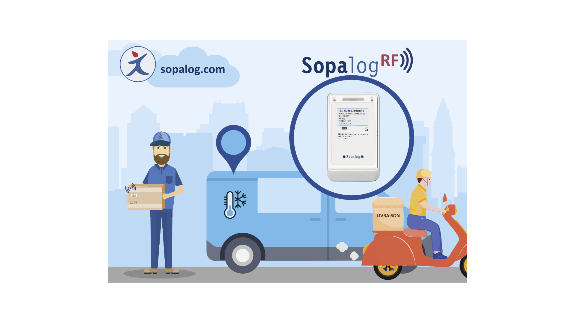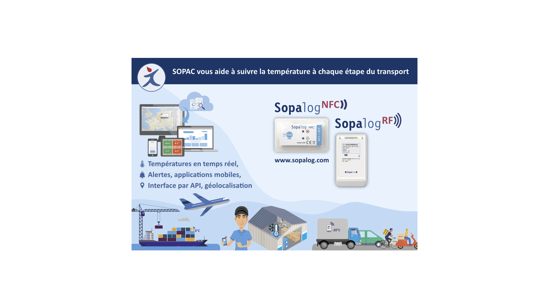 Spécialiste de la chaîne du froid, Sopac est une société française qui commercialise des enregistreurs de température connectées (Sopalog) pour assurer le suivi des produits thermosensibles pendant le transport.