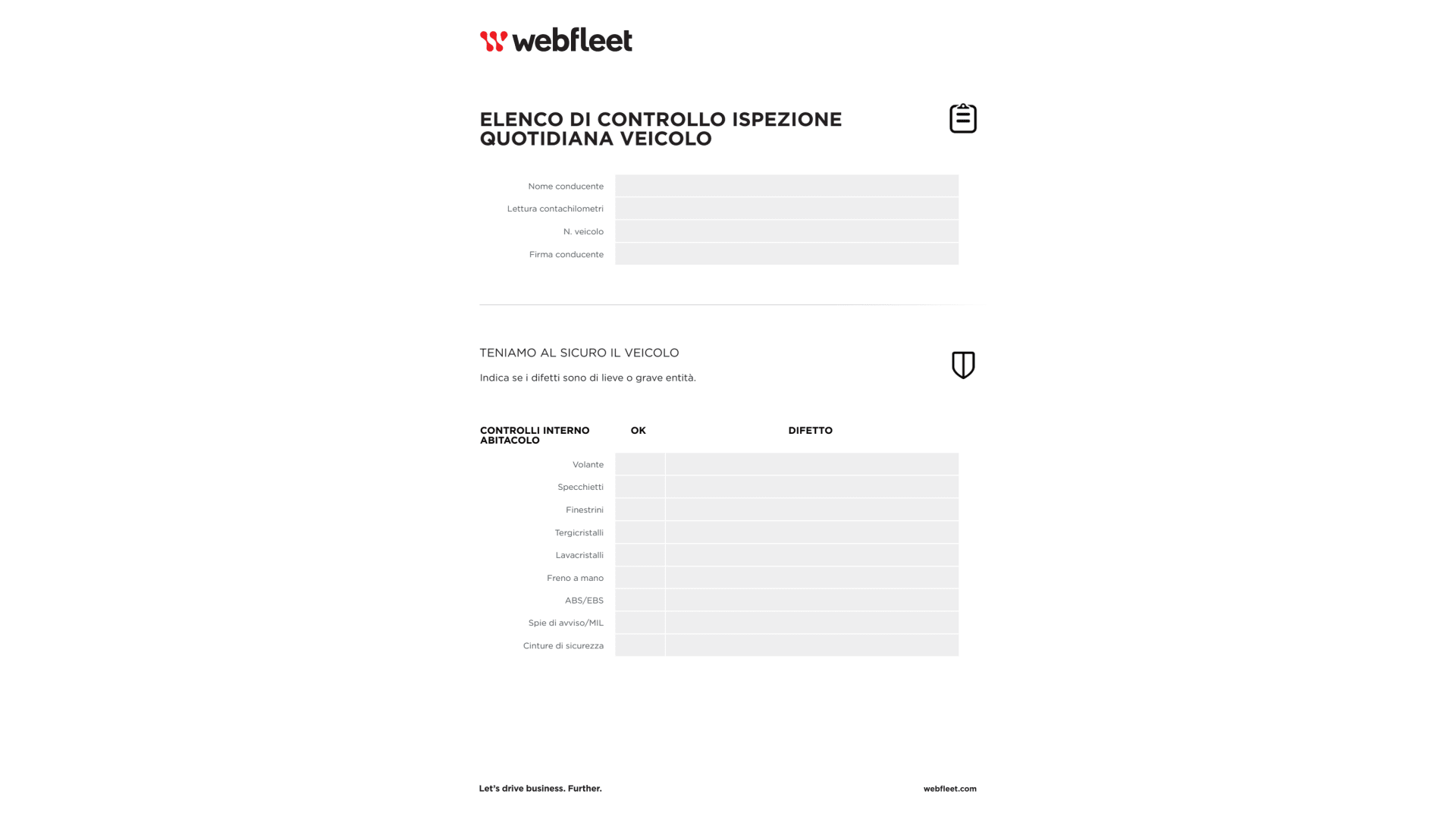 Con la checklist di sicurezza di Webfleet, tu e i tuoi conducenti non dovrete preoccuparvi di perdere nulla all'interno o all'esterno dell'abitacolo. Utilizza la nostra checklist gratuita per l'ispezione dei veicoli per: