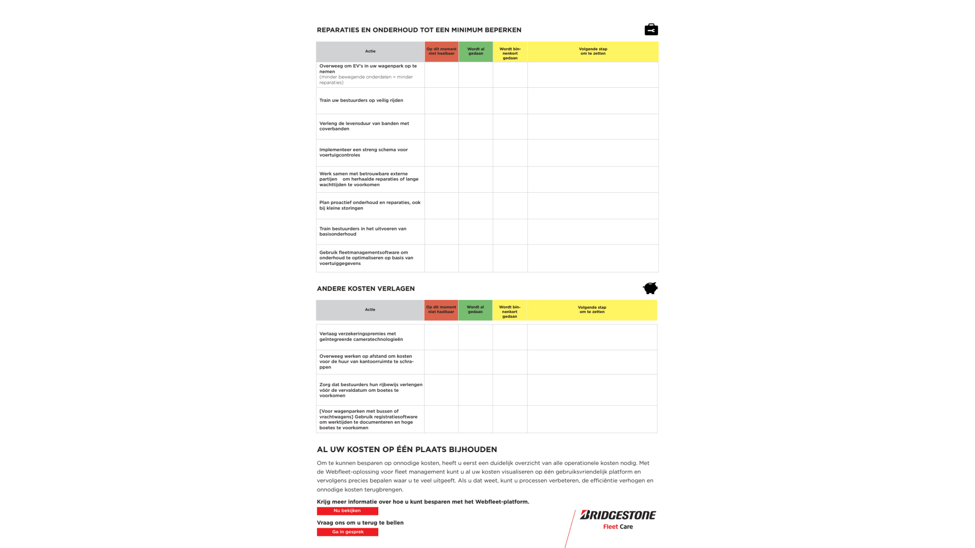 Het is belangrijk dat u elk voertuig vóór gebruik op de juiste wijze uitrust. Banden met een te hoge rolweerstand voor het voertuig verhogen bijvoorbeeld het brandstofverbruik. Gebruik een checklist om kostbare fouten zoals deze te voorkomen.