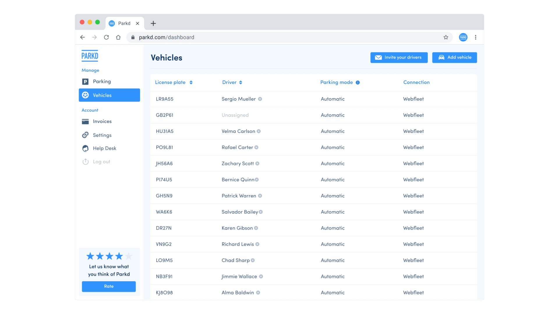 Parkd automa­ti­seert parkeer­sessies en bespaart wagenparken tot 20% op parkeer­kosten. Dankzij naadloze Webfleet-in­te­gratie start u binnen 5 minuten. Beheer alles eenvoudig in één dashboard. Geschikt voor alle wagenparken, actief in heel Nederland en vertrouwd door klanten als Alliander, Stedin, Eneco en Rentokil.