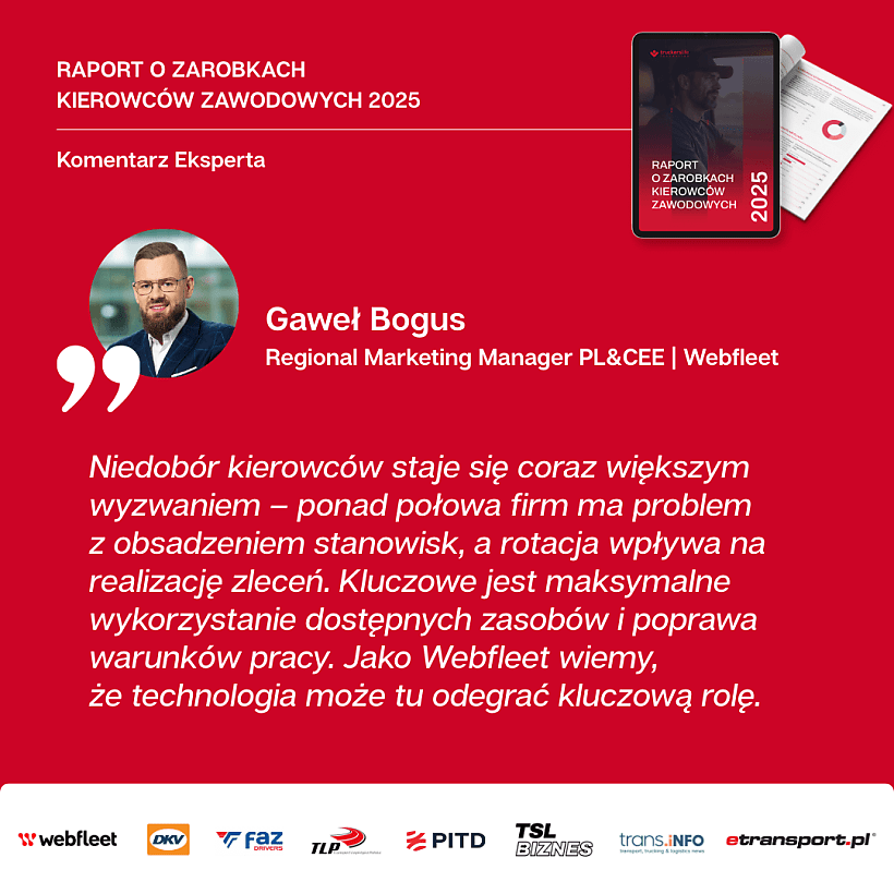 To właśnie w tym obszarze technologie flotowe mogą bezpośrednio wpływać na stabilność zespołów, co podkreśla w raporcie Truckers Life Foundation Gaweł Bogus, Regional Marketing Manager, Webfleet. Zauważa on, że narastający niedobór kierowców i rosnąca rotacja wymagają od firm nie tylko sprawnej organizacji pracy, lecz także mądrze wykorzystanych narzędzi cyfrowych, które poprawiają warunki pracy, wspierają kierowców na każdym etapie zlecenia i realnie wzmacniają retencję.