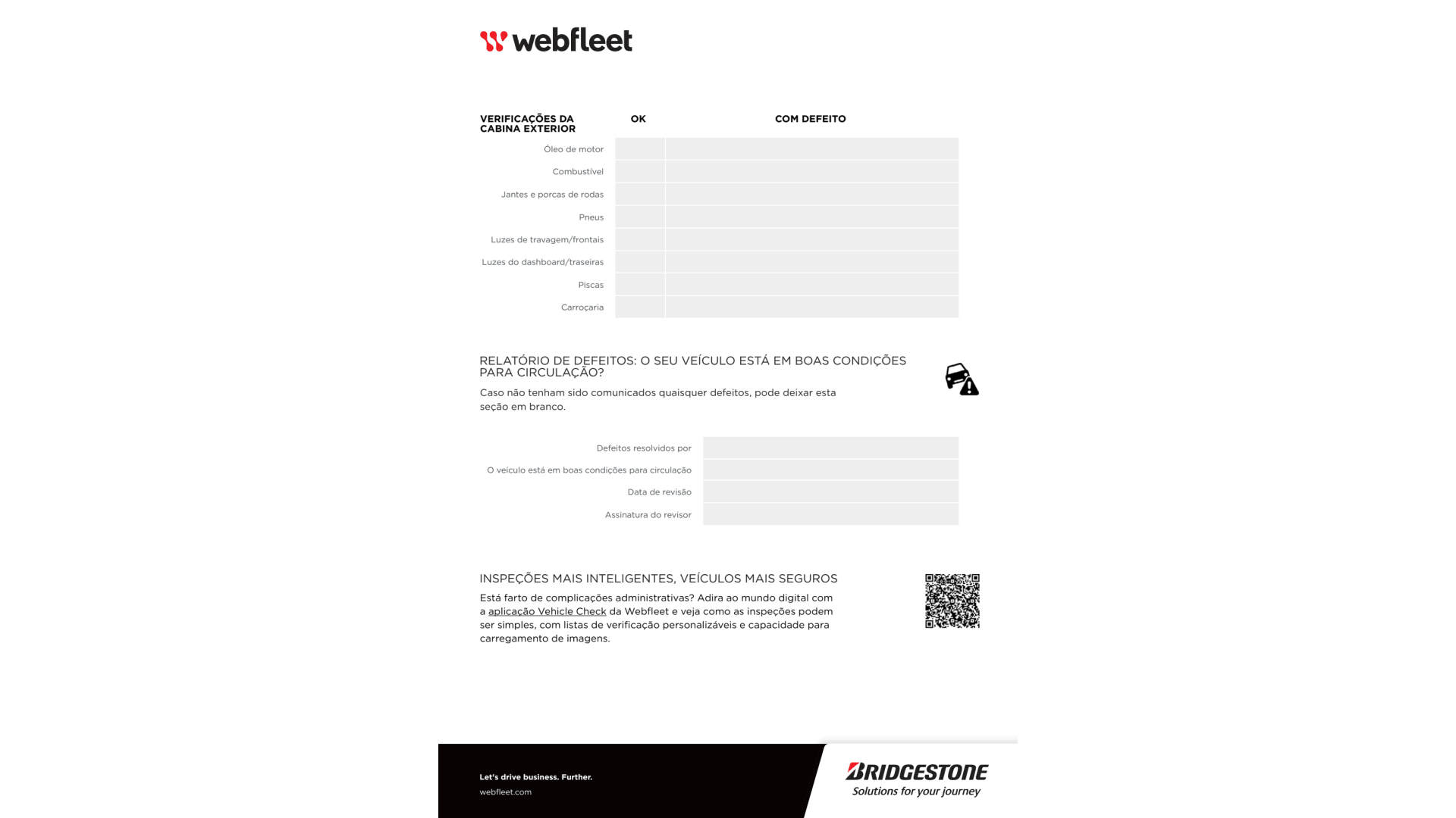 Precisa de uma forma fácil e normalizada de realizar as inspeções diárias dos seus veículos? Entregue cópias da nossa lista de verificação para inspeções de veículos da frota aos seus condutores. O formulário passível de impressão inclui todos os campos necessários para as verificações do interior e exterior da cabina, com uma secção para comunicar defeitos.